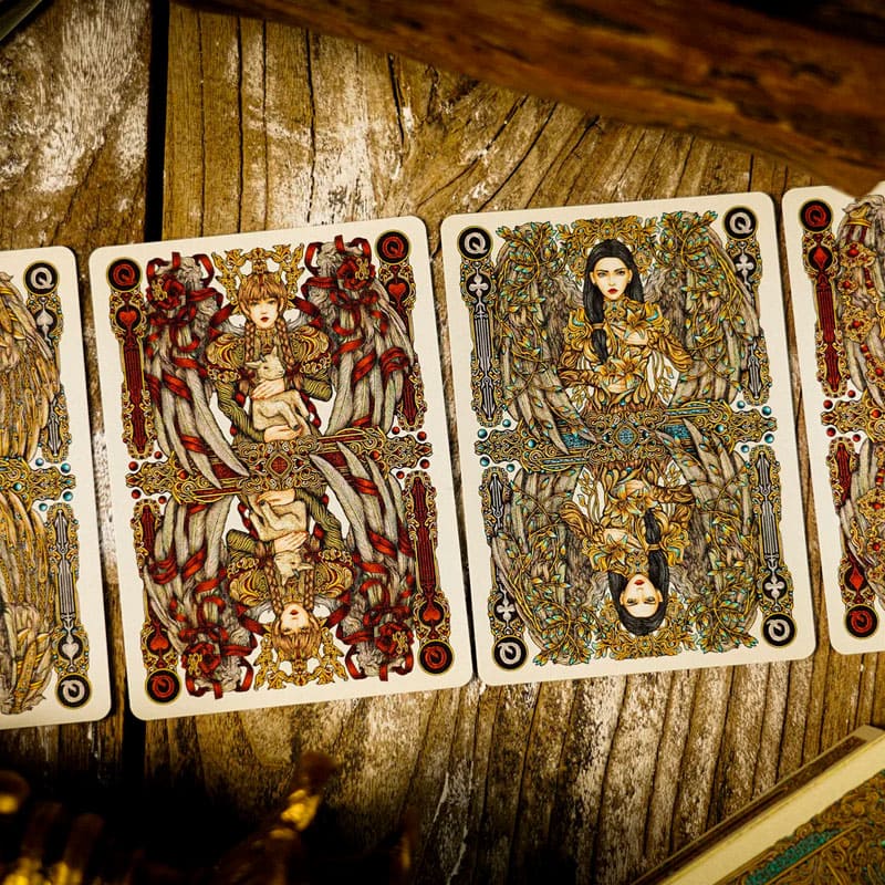 A edição Halidom é um convite para explorar a delicadeza e a grandiosidade da arte em escala reduzida. Cada carta traz camadas de ilustração complexa, resultado da direção criativa de Lun Zi, renomado cardist, cuja habilidade em criar padrões intricados e ilustrações impactantes eleva o baralho ao patamar de obra de arte.