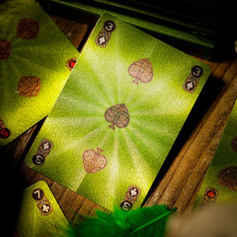 Limitado a apenas 555 unidades numeradas, este set vem apresentado em um estojo de couro luxuoso, símbolo da maestria artesanal da Ark. No interior, encontra-se o exclusivo baralho Halidom Viridian, onde cada carta carrega a complexidade artística e a precisão gráfica que caracterizam a marca. O acabamento especial Dawn HOLO & Mystery Finish garante brilho, profundidade e um efeito visual hipnótico que transforma cada carta em uma pequena obra de arte.