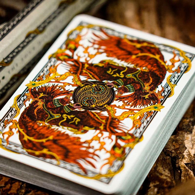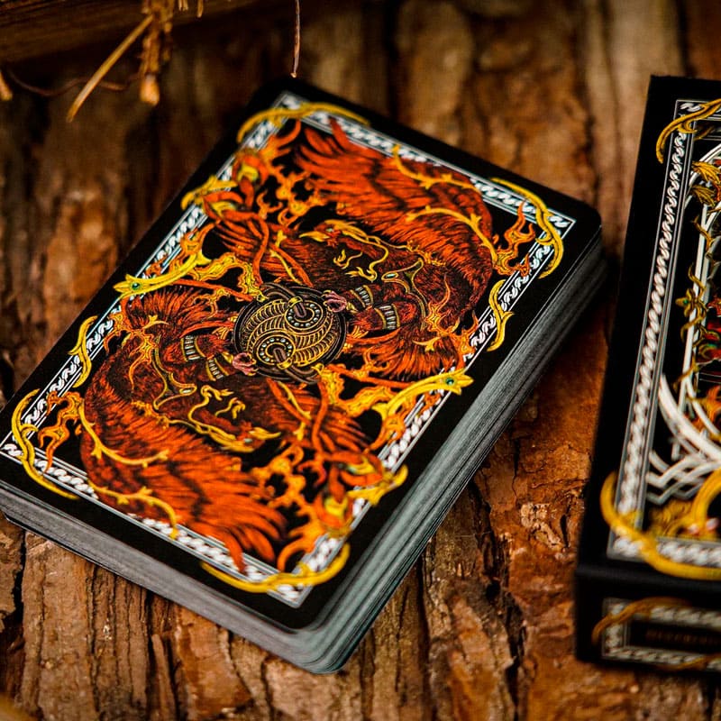 Limitado a apenas 1000 unidades numeradas, o set inclui dois baralhos exclusivos — preto e branco — que traduzem a dualidade entre a intensidade das chamas e a serenidade da brancura. Cada carta foi trabalhada com meticuloso detalhamento gráfico, trazendo à vida a imagem do pássaro lendário que, ao abrir suas asas, desperta ventos e incendeia céus.