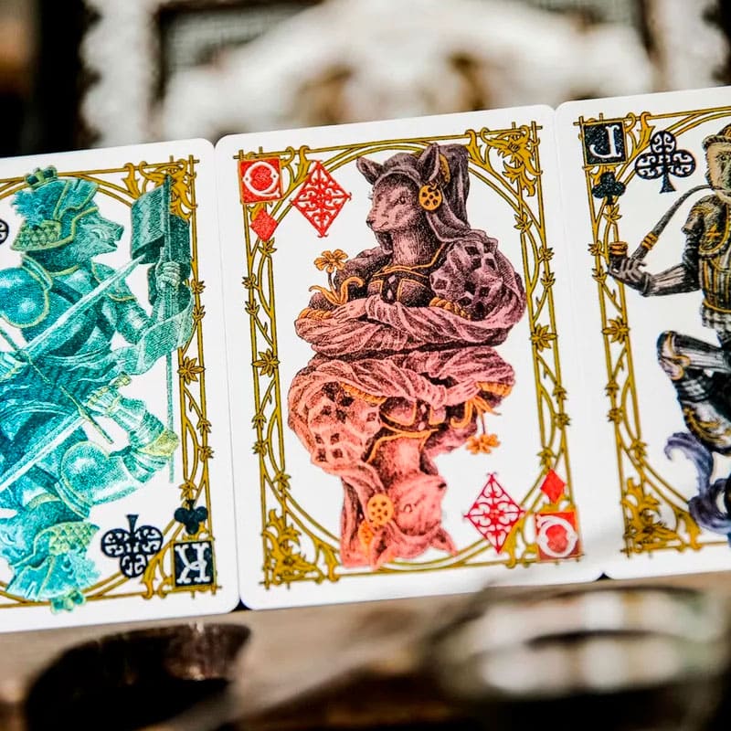 O requinte não para nas cartas: a embalagem é um verdadeiro show de design. Sua tampa interna é adornada com três camadas de papel cortado a laser, em um trabalho artesanal que cria uma representação tridimensional e detalhada de um palácio. Um feito técnico que une tradição, inovação e a paixão da Ark por elevar o baralho à condição de arte de luxo.
