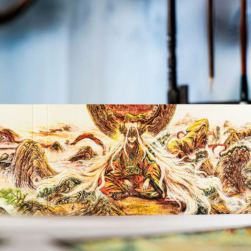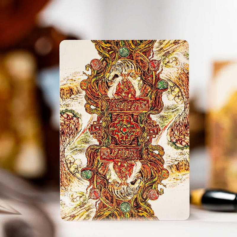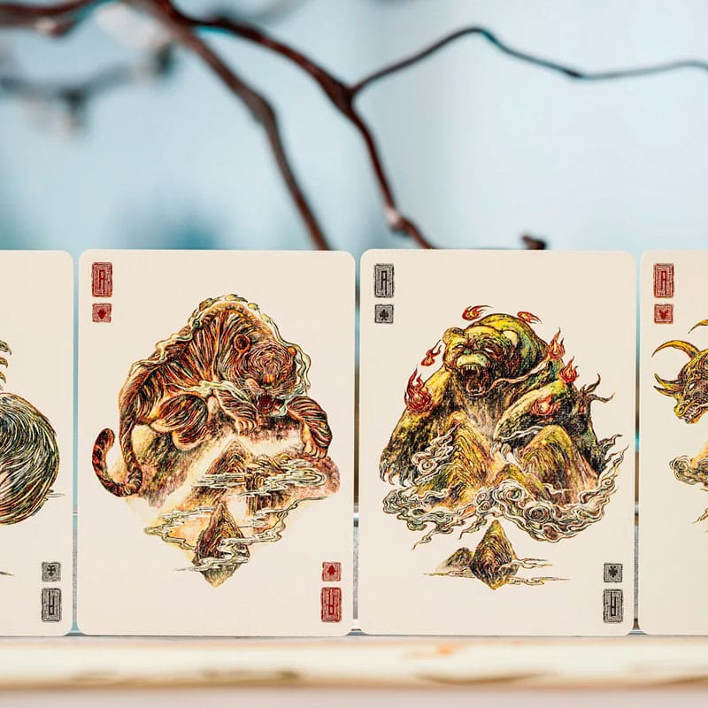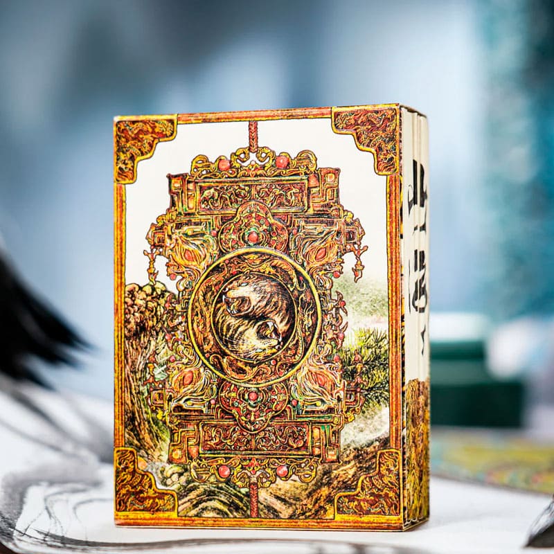 Com produção restrita a 3333 unidades numeradas individualmente, este baralho une tradição e inovação. As cartas são adornadas com ilustrações em estilo de tinta chinesa, detalhadas com perfeição, recriando seres lendários e paisagens míticas que atravessam séculos de cultura. O verso tridimensional das cartas adiciona profundidade e movimento, transformando cada manuseio em um espetáculo visual.