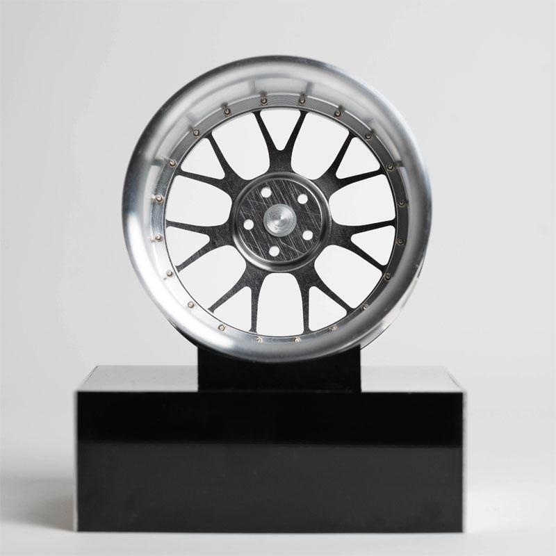 Forjada em alumínio de liga premium, cada detalhe da roda real foi capturado por meio de escaneamento 3D de altíssima fidelidade, garantindo proporções e texturas absolutamente fiéis. O acabamento em Platinum Grey confere um brilho sóbrio e sofisticado, ideal para quem valoriza elegância com performance. É mais do que uma miniatura: é um símbolo da herança BBS reinterpretado como peça de design.