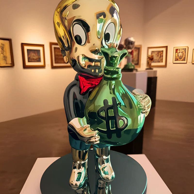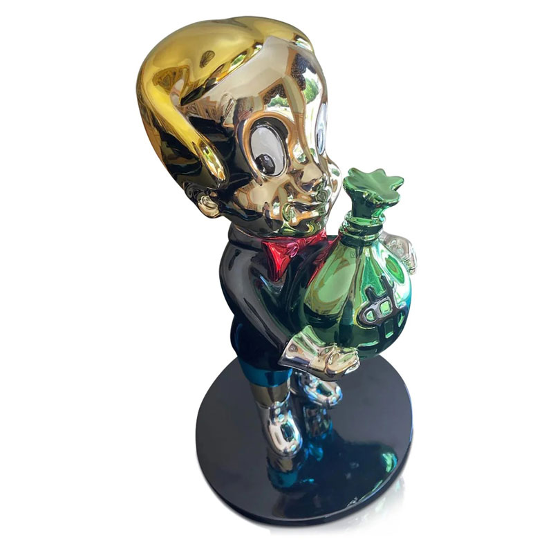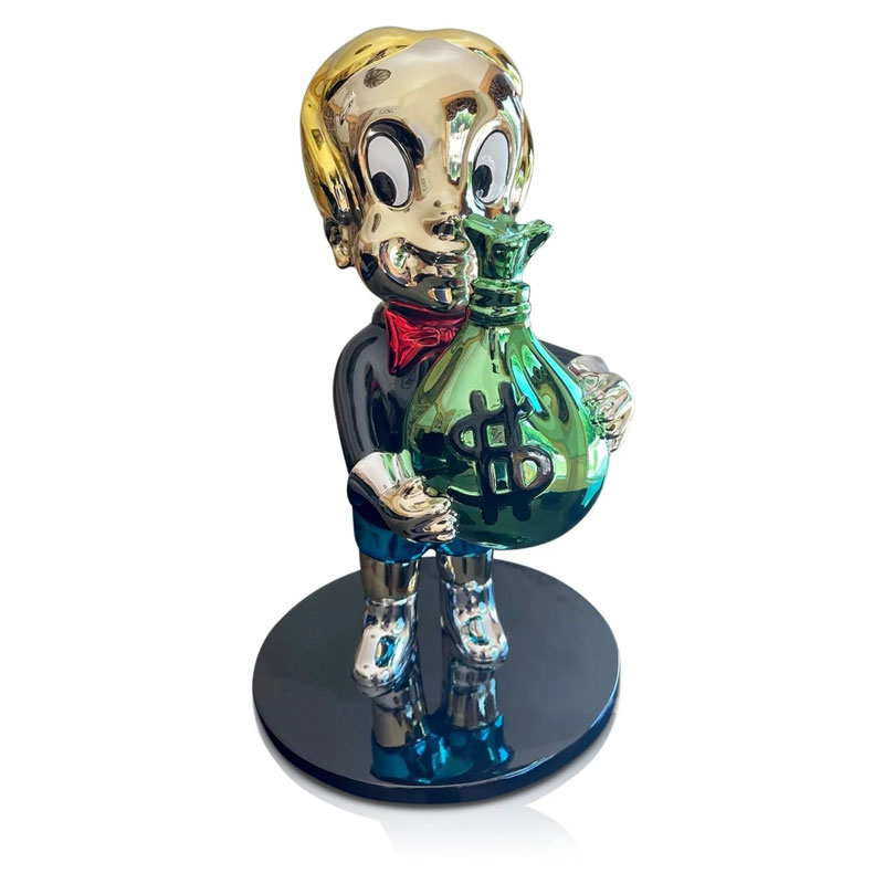 Com 40 cm de altura e 6,5 kg, a escultura se impõe como um ícone instantâneo. O acabamento em cromagem espelhada e eletrocoloração vibrante remete ao brilho das riquezas e à estética ousada do personagem Richie Rich, trazendo nostalgia da cultura pop com um toque de luxo moderno. Colocada em destaque em um living de design contemporâneo, escritório executivo ou galeria, a obra captura olhares e desperta conversas.
