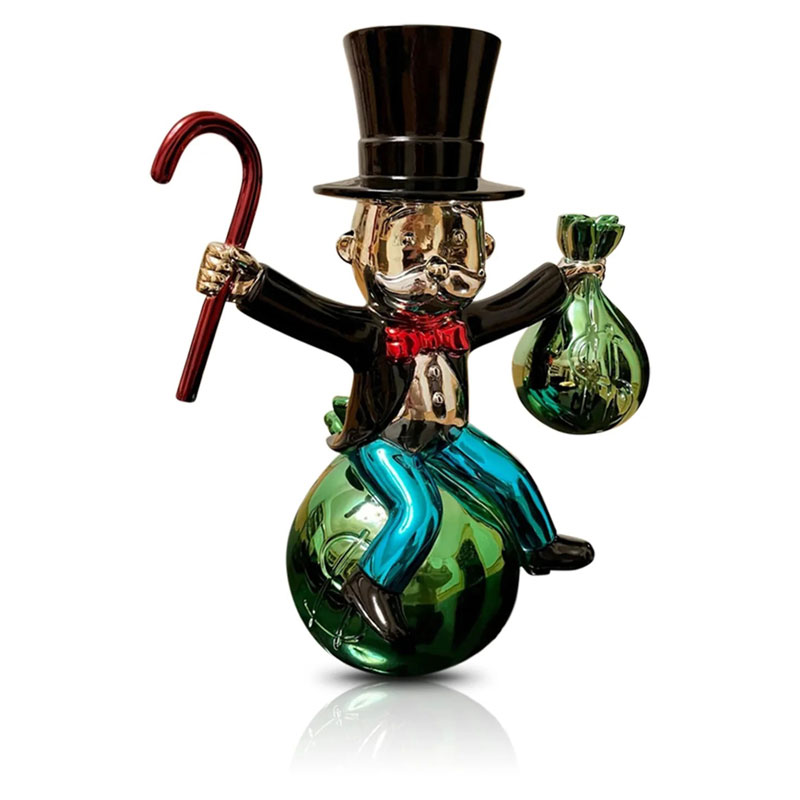 A peça Monopoly Sitting on $ Bag™ mede 40 cm de altura e pesa 6,5 kg, impondo presença em qualquer espaço. Seu acabamento em cromagem de alto brilho e eletrocoloração vibrante transforma a icônica figura do magnata do Monopoly em um objeto de desejo absoluto. Combinando nostalgia, cultura pop e design contemporâneo, esta escultura é capaz de transformar um ambiente em um verdadeiro palco de luxo e irreverência.