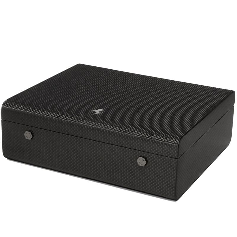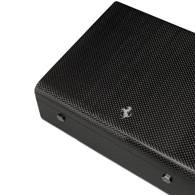 Produzido 100% na Itália, o set apresenta dois baralhos de cartas elegantemente acomodados em um estojo de madeira com revestimento externo em fibra de carbono e interior em couro legítimo. Um design que ecoa os materiais que tornaram a Ferrari referência mundial em inovação e performance.