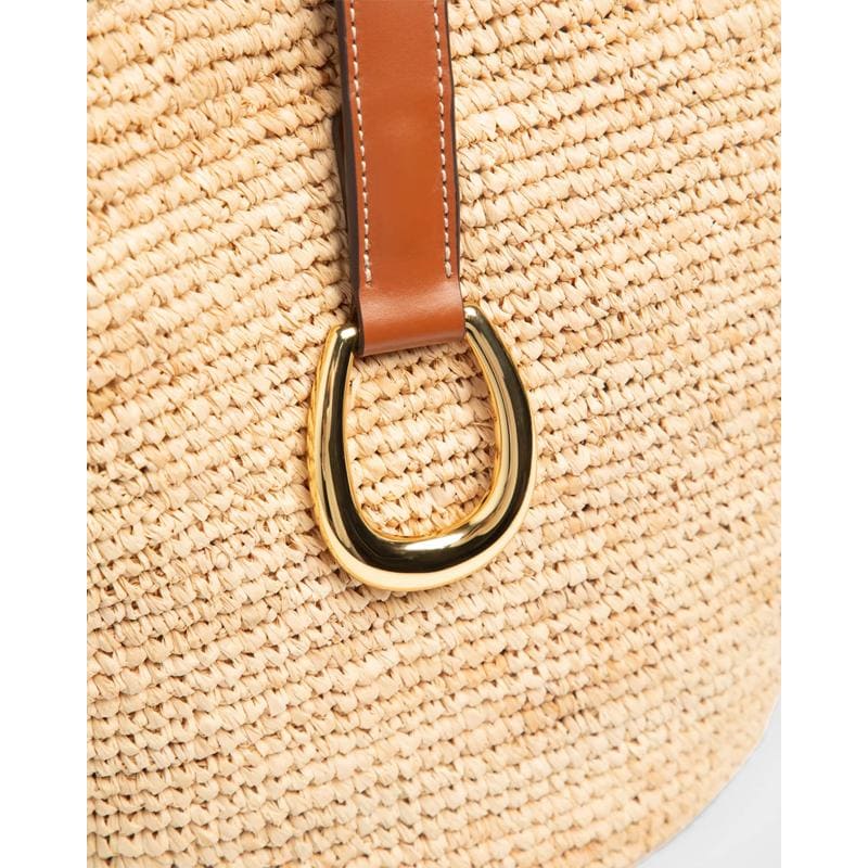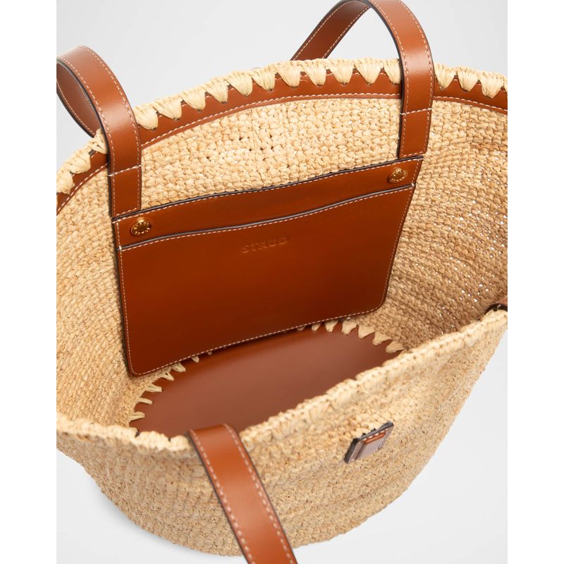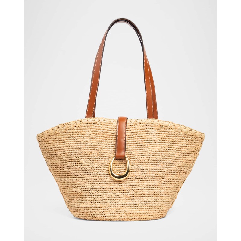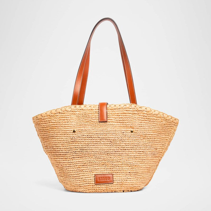 A Staud Bolsa Beach Vista Raffia interpreta o estilo Beach em design de praia, com texturas naturais e leveza. Materiais como rafia/palha, com alça de ombro, detalhes icônicos em monograma.