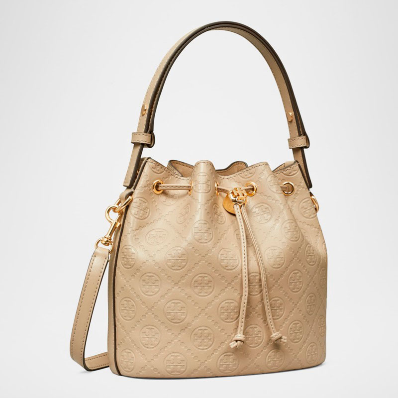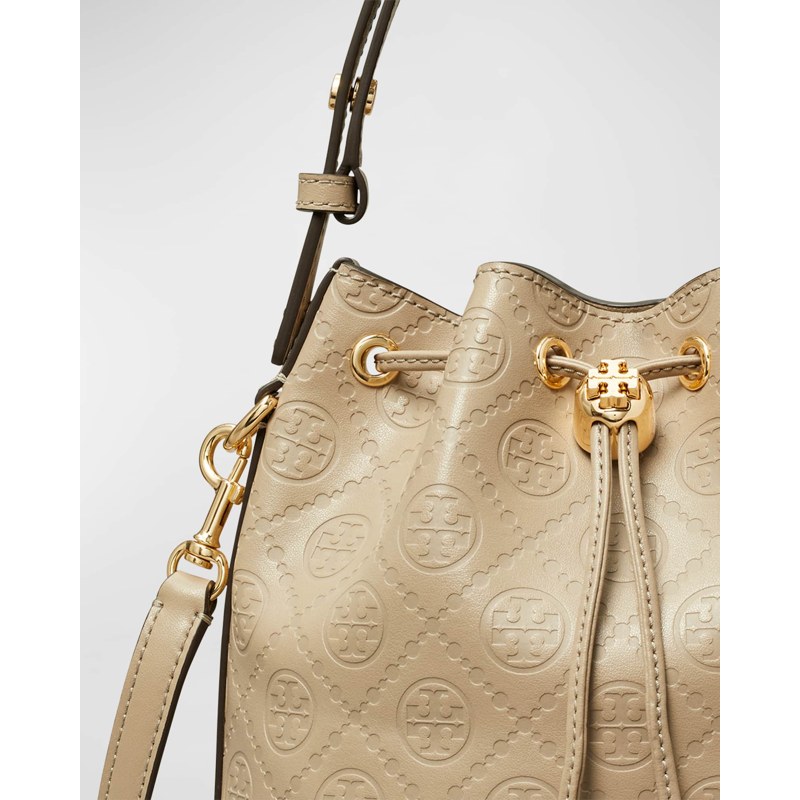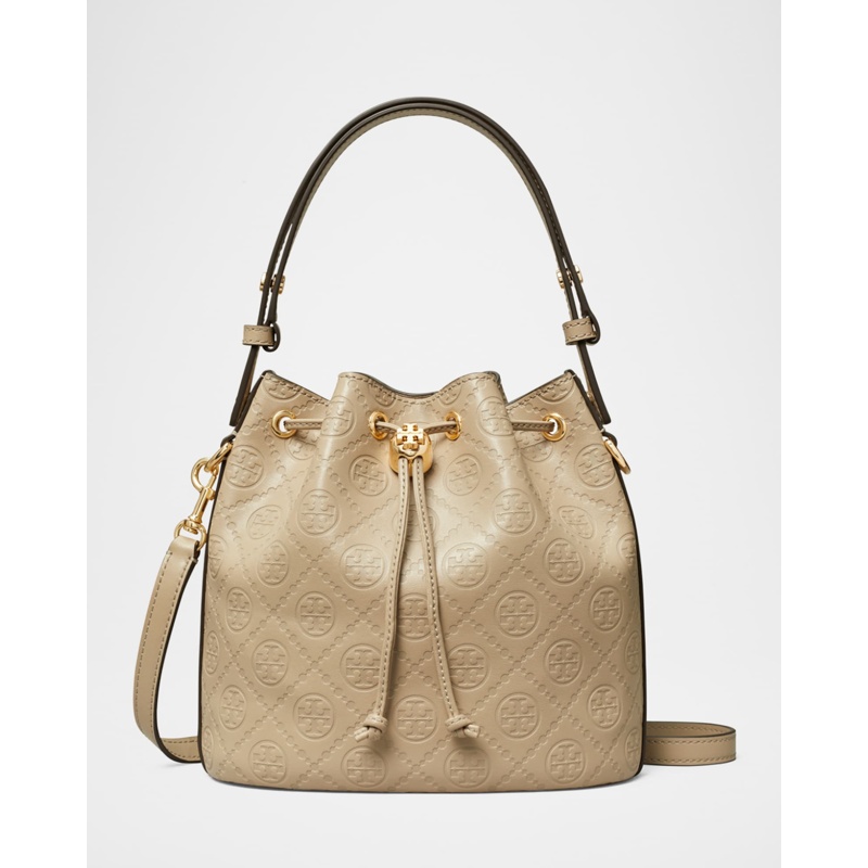 A Tory Burch Bolsa Bucket T Monogram interpreta o estilo Bucket em design de mão/ombro, com copo cilíndrico com fecho ajustável. Com alça de mão, alça de ombro, detalhes icônicos em monograma.
