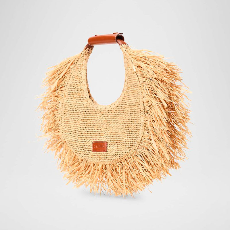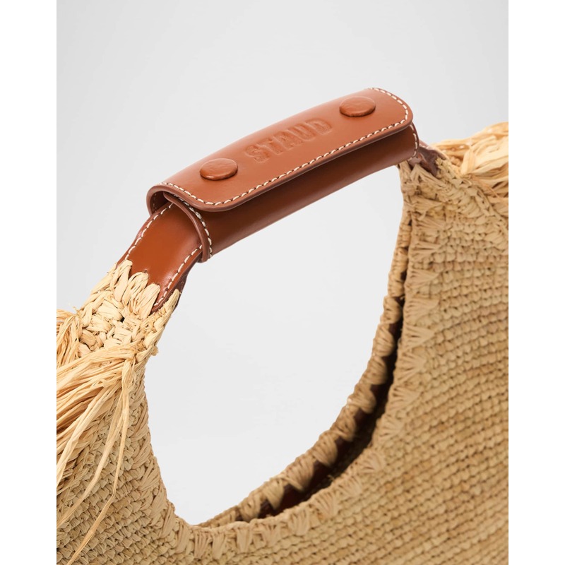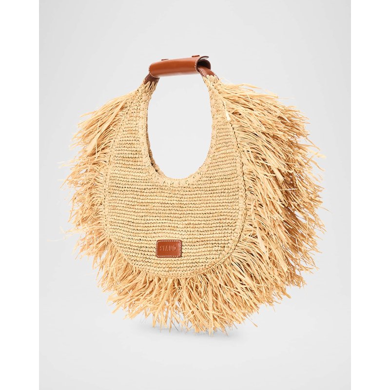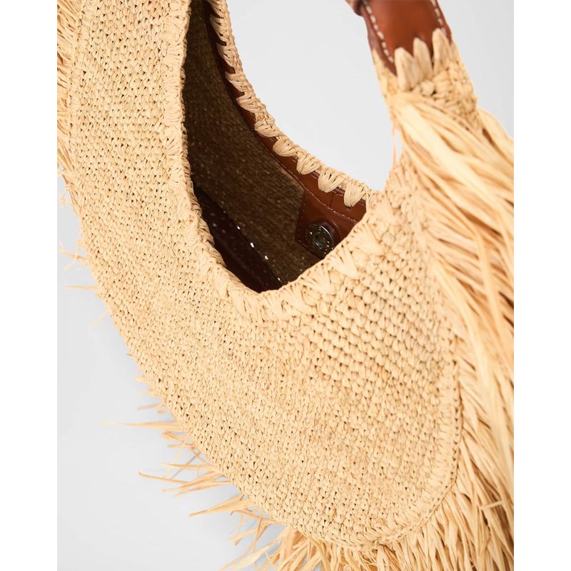 A Staud Bolsa Beach Large Moon Fringe Raffia interpreta o estilo Beach em design de praia, com texturas naturais e leveza. Materiais como rafia/palha, com alça de ombro, detalhes icônicos em monograma.