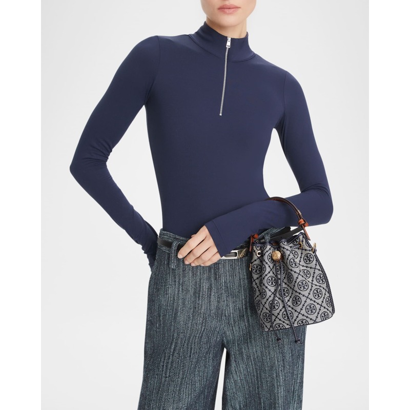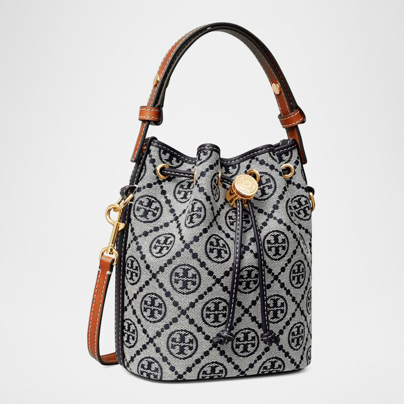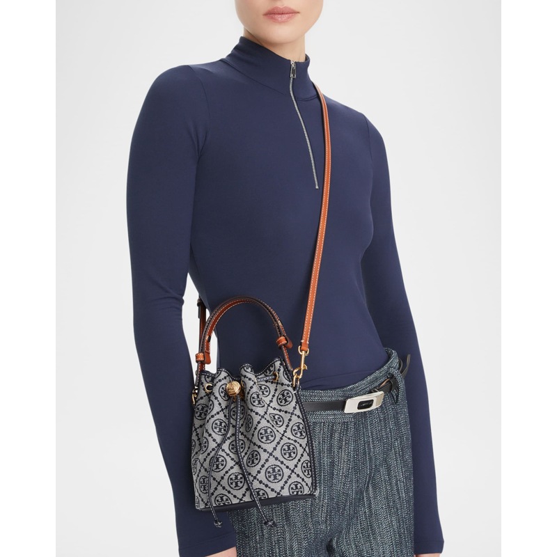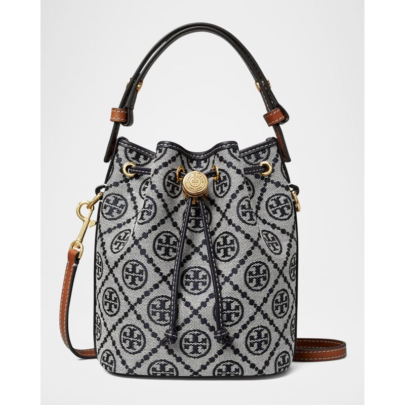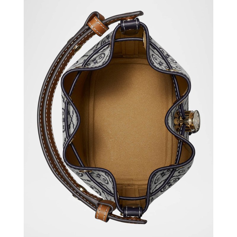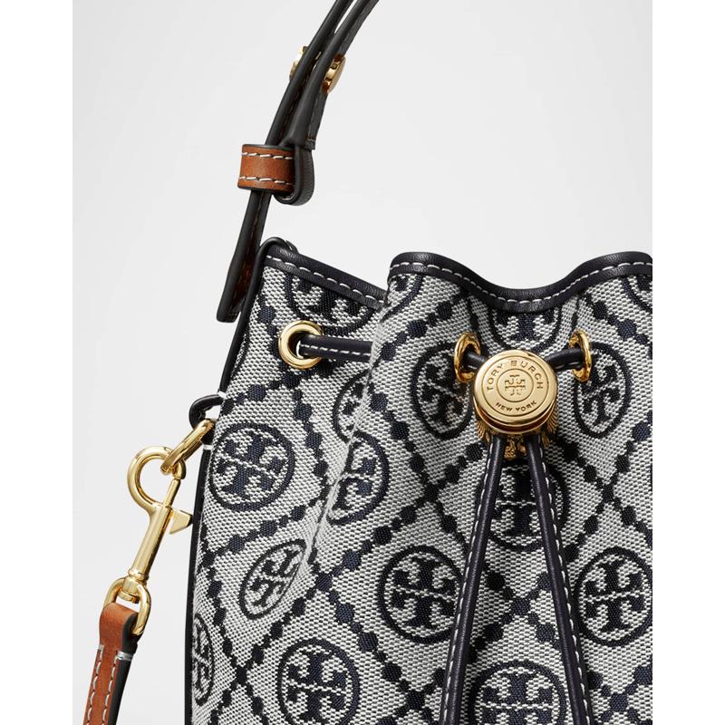 A Tory Burch Bolsa Bucket Mini T Monogram Canvas interpreta o estilo Bucket em design de mão/ombro, com copo cilíndrico com fecho ajustável. Materiais como canvas, com alça de mão, alça de ombro, detalhes icônicos em monograma.