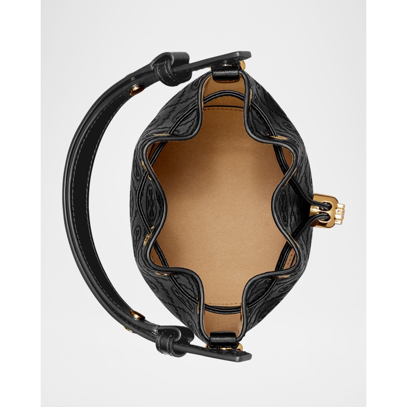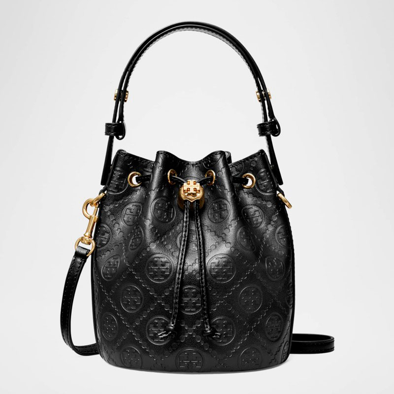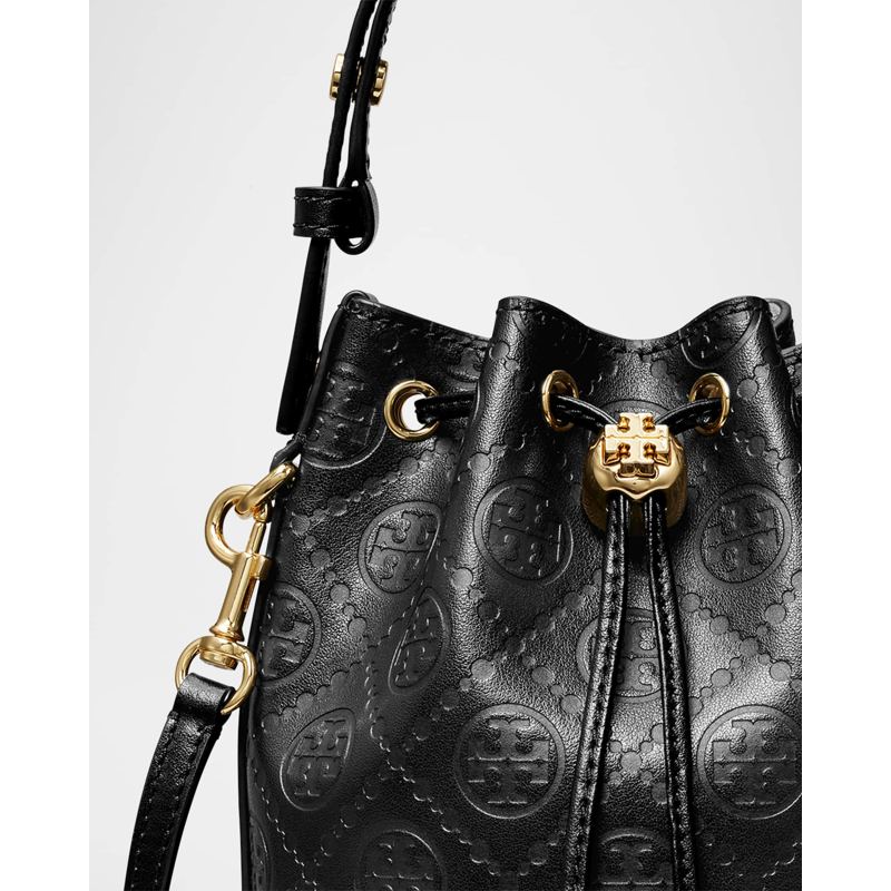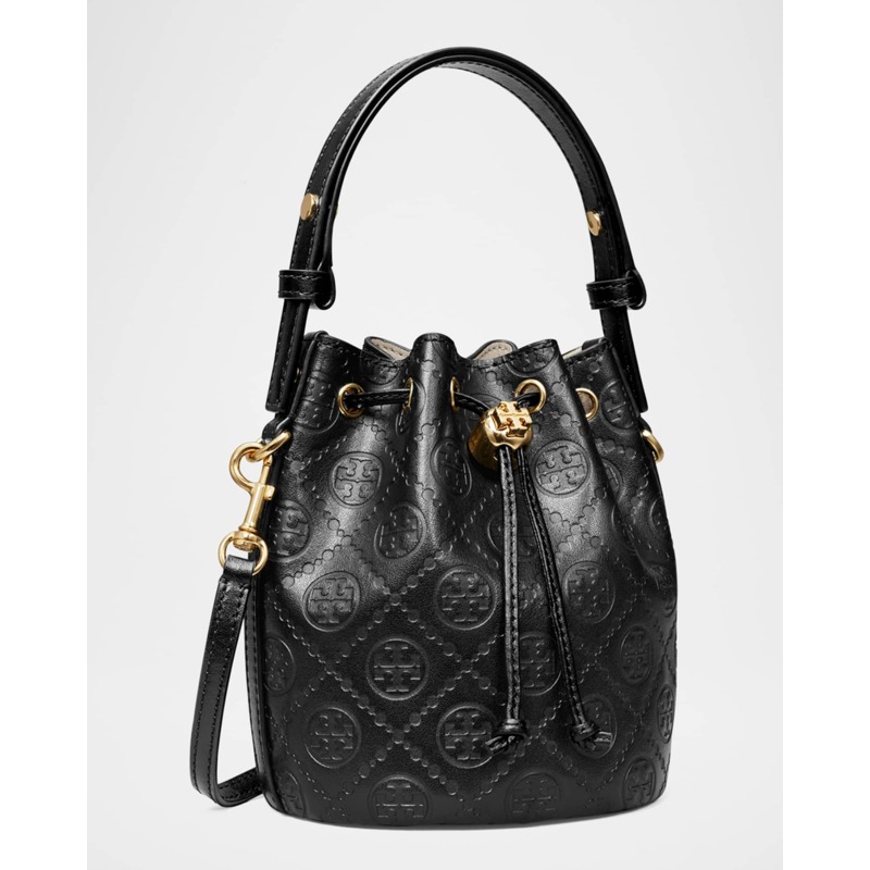 A Tory Burch Bolsa Bucket T Monogram Mini interpreta o estilo Bucket em design de mão/ombro, com copo cilíndrico com fecho ajustável. Com alça de mão, alça de ombro, detalhes icônicos em monograma.