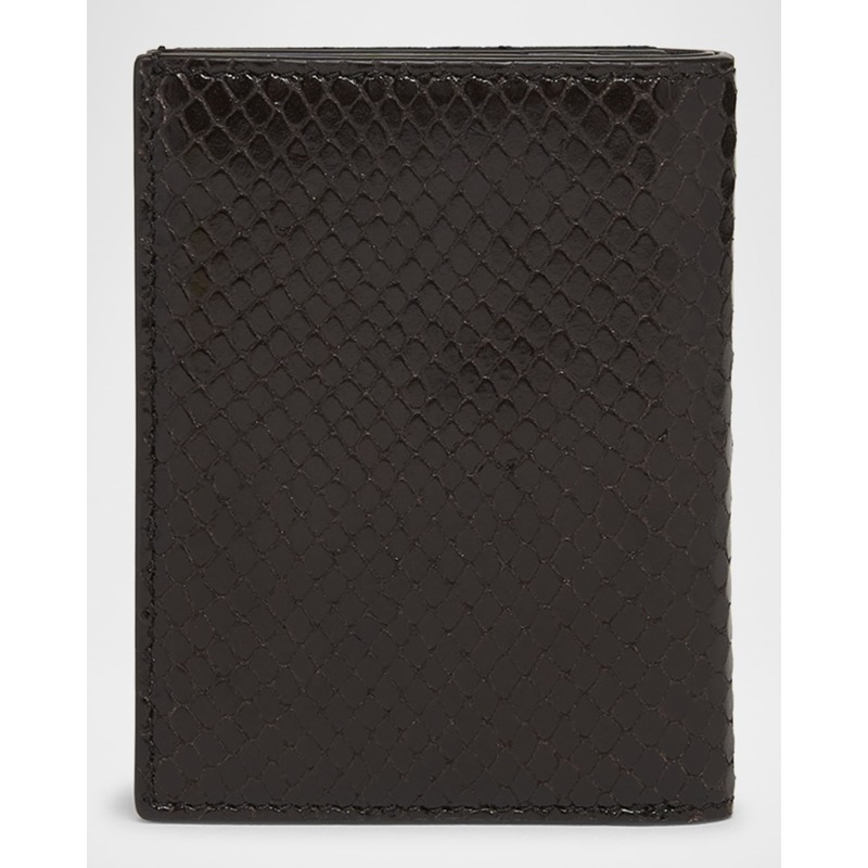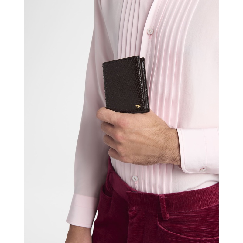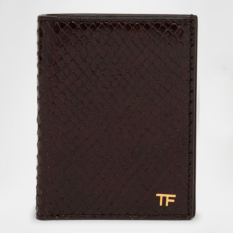 A Tom Ford Bolsa Wallet T Line Python-Effect Bifold interpreta o estilo Wallet em design de carteira, com formato plano pensado para organização. Materiais como couro exótico, com sem alça ou pulseira de mão, detalhes icônicos em monograma.