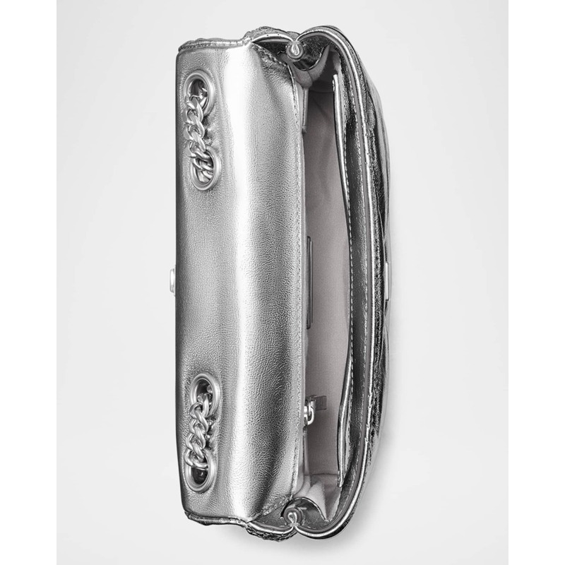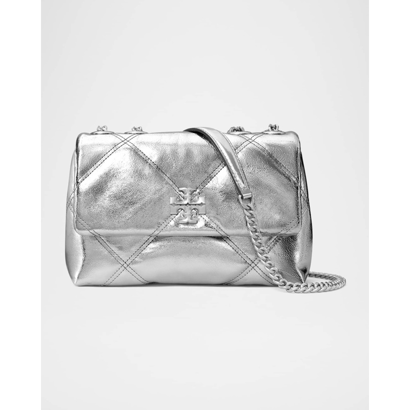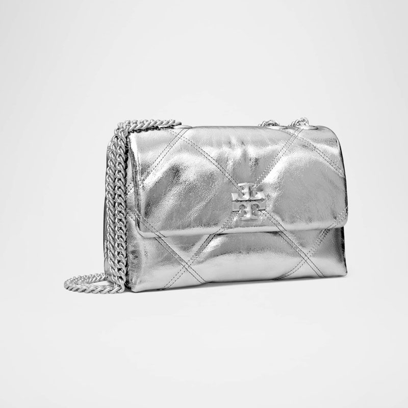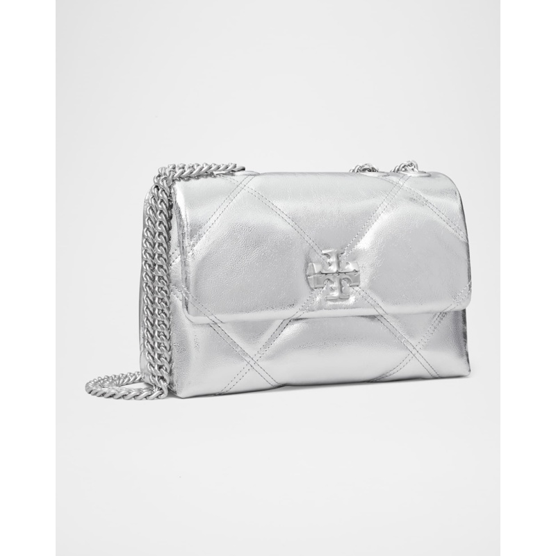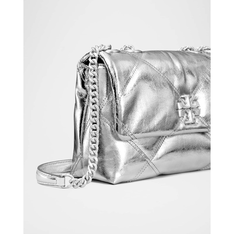 A Tory Burch Bolsa Shoulder Kira Small Metallic Quilted Convertible interpreta o estilo Shoulder em design de ombro, com silhueta que abraça o corpo e otimiza mobilidade. Com alça de ombro, detalhes icônicos em matelassê.