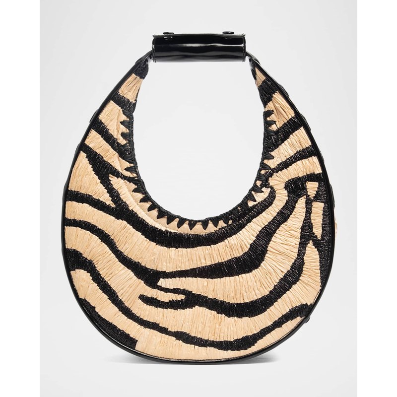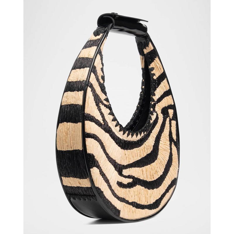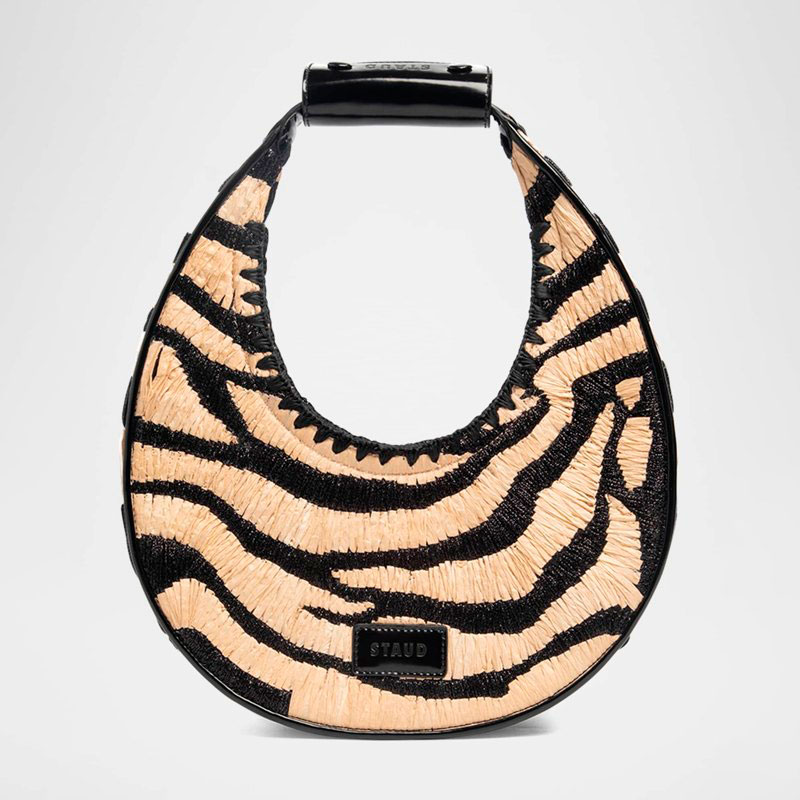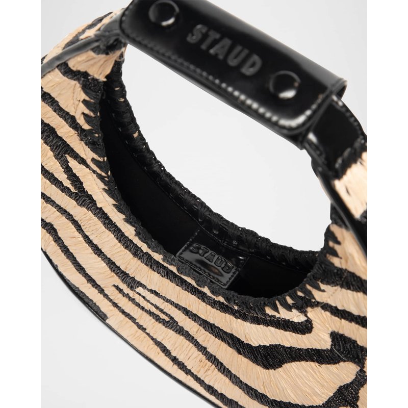 A Staud Bolsa Shoulder Moon Zebra Raffia interpreta o estilo Shoulder em design de ombro, com silhueta que abraça o corpo e otimiza mobilidade. Materiais como rafia/palha, com alça de ombro, detalhes icônicos em monograma.