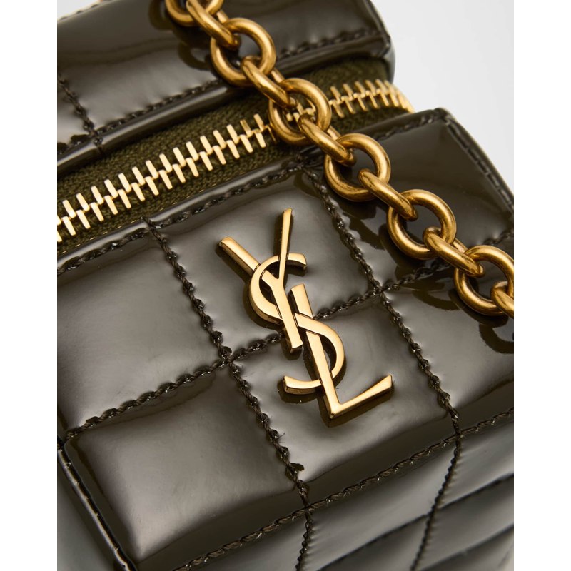 Feita em couro envernizado (patent), com acabamento envernizado, a peça destaca monograma YSL em metal. O design privilegia praticidade sem perder sofisticação, com atenção aos acabamentos e à ergonomia no uso.