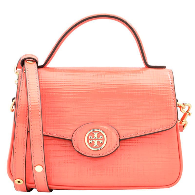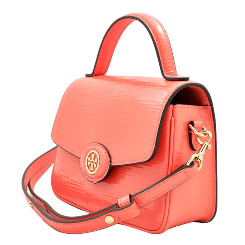 A Tory Burch Bolsa Handle Coral Crush Robinson Small TopHandle interpreta o estilo Handle em design de mão, com estrutura gráfica com presença, feminina e firme. Com alça de mão.