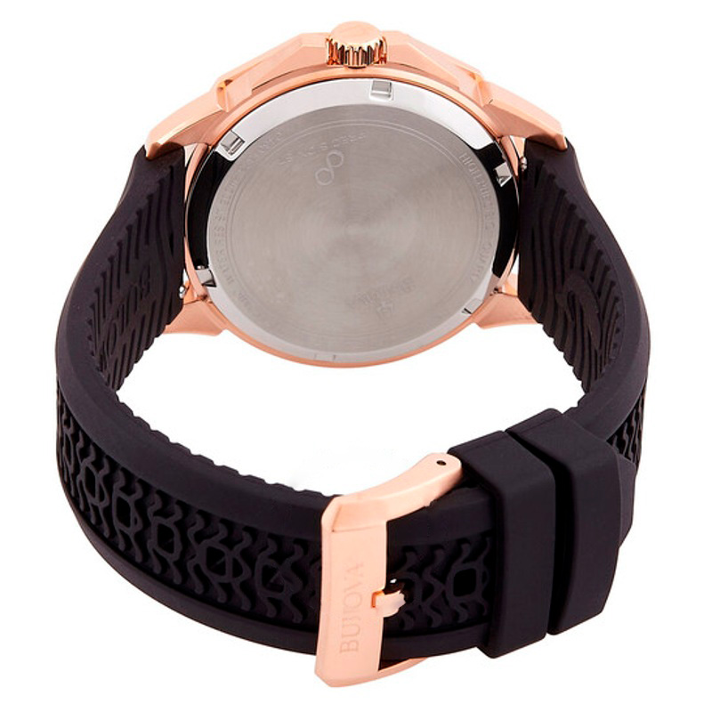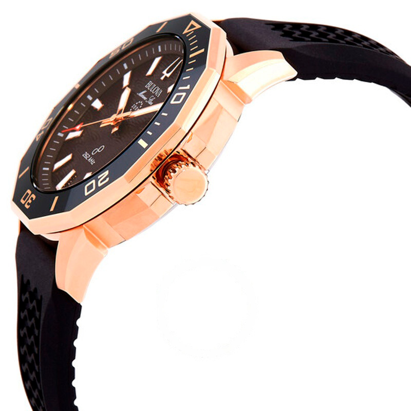 O Bulova Marine Star HPQ Precisionist Quartzo Marrom Mostrador 43 mm Traz uma leitura arquitetônica do tempo com superfícies bem trabalhadas. Caixa em aço inoxidável, rosa, cerâmica, Luneta cerâmica, Mostrador preto, 43 mm.