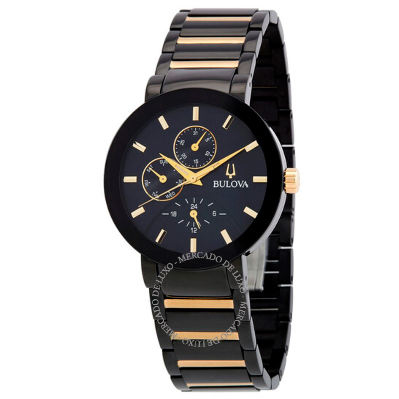 O Bulova Mostrador preto de quartzo moderno 40 mm Interpreta os códigos da casa com serenidade e atenção à luz. Caixa em aço inoxidável, Mostrador preto, 40 mm.A manufatura calibra o movimento...
