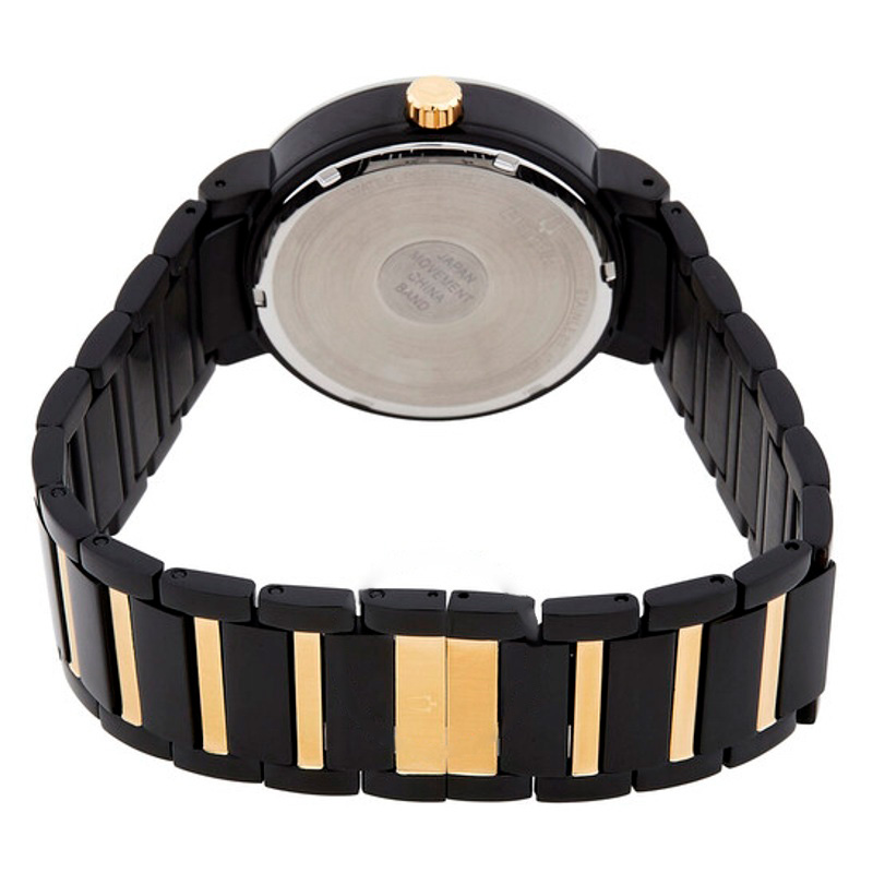 O Bulova Mostrador preto de quartzo moderno 40 mm Interpreta os códigos da casa com serenidade e atenção à luz. Caixa em aço inoxidável, Mostrador preto, 40 mm.