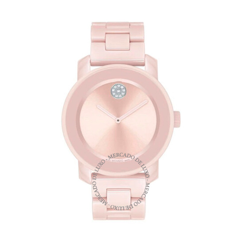 O Movado Mostrador rosa de quartzo em negrito 36 mm traz design de linhas limpas e presença silenciosa — o luxo que não precisa anunciar-se. 36 mm. Texturas bem resolvidas falam de precisão e cuidado...