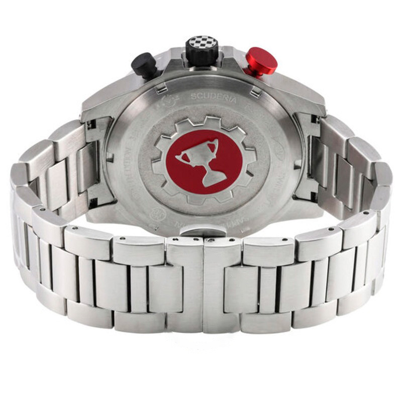 A arquitetura do mecanismo privilegia robustez estrutural e regularidade de marcha. Movimento quartzo, complicações: data, cronógrafo, vidro safira, WR 100 m, pulseira bracelete metálico.