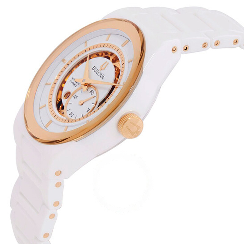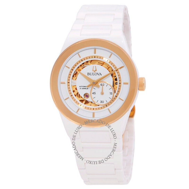 O Bulova Mostrador branco automático Millenia moderno Traz uma leitura arquitetônica do tempo com superfícies bem trabalhadas.