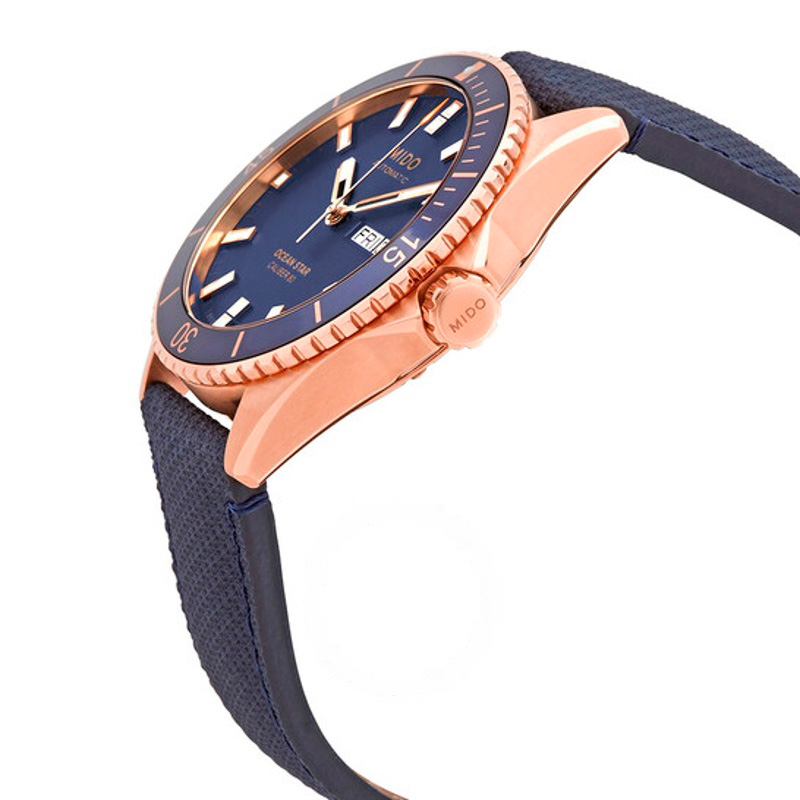 O Mido Ocean Star Automático Mostrador Azul 42 mm Interpreta os códigos da casa com serenidade e atenção à luz. Caixa em aço inoxidável, rosa, Mostrador azul, 42 mm.