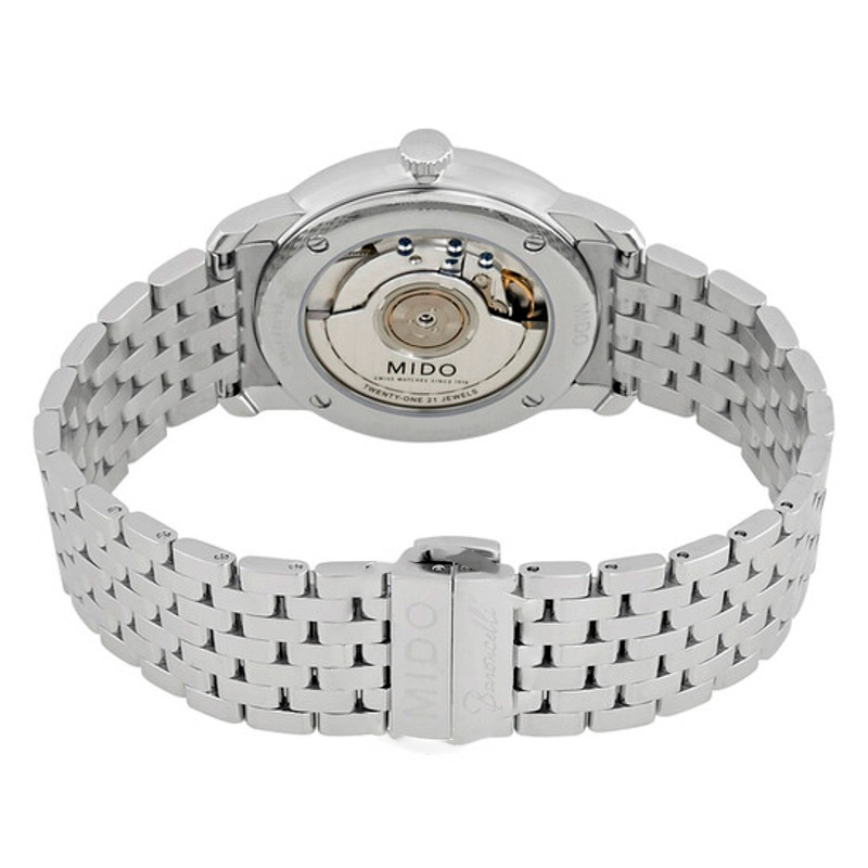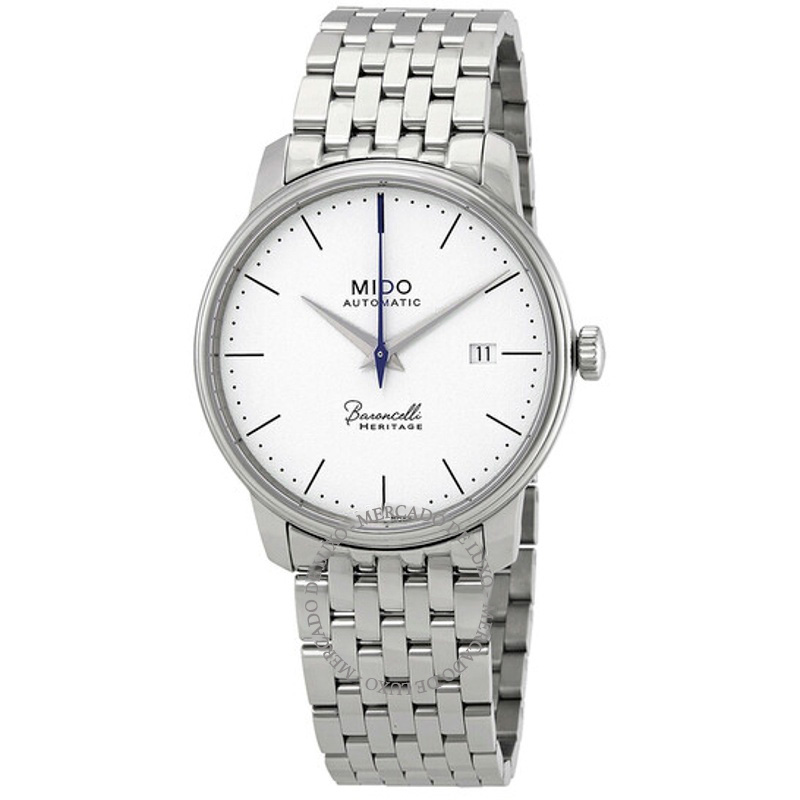 O Mido Baroncelli III Automático Mostrador Branco 39 mm Aposta em linhas limpas e volume preciso — luxo que não grita. Caixa em aço inoxidável, Mostrador prateado, 39 mm.