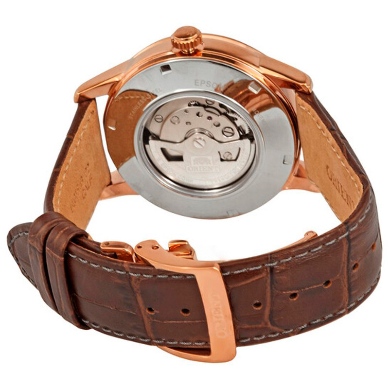 O Orient Sol e Lua Mostrador Automático Champanhe 42 mm Aposta em linhas limpas e volume preciso — luxo que não grita. Caixa em aço inoxidável, rosa, Mostrador preto, 42 mm.