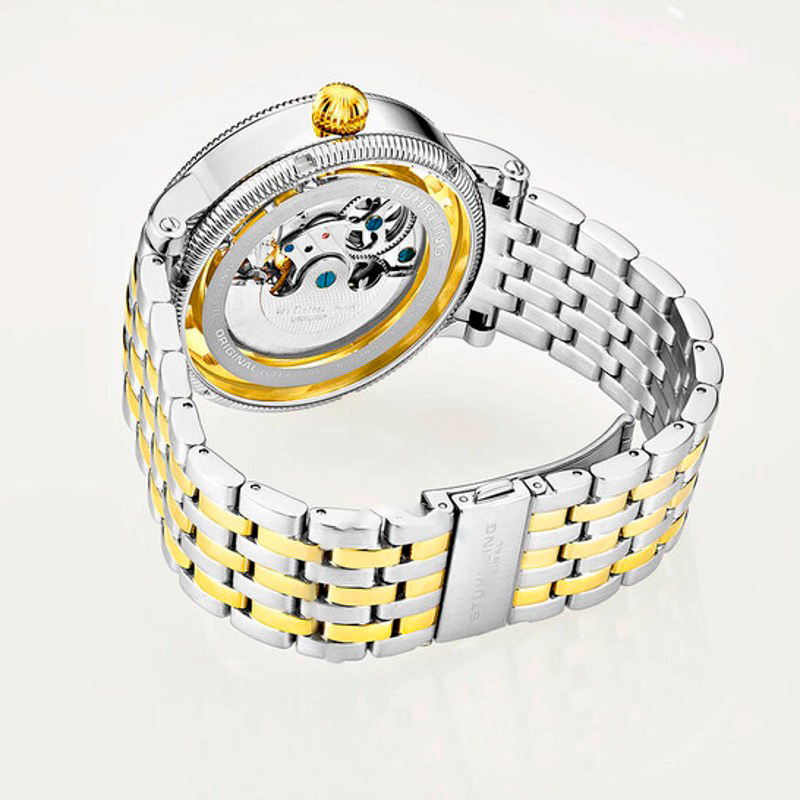 O Stührling Original Mostrador dourado automático Legacy Traz uma leitura arquitetônica do tempo com superfícies bem trabalhadas. Mostrador champagne.