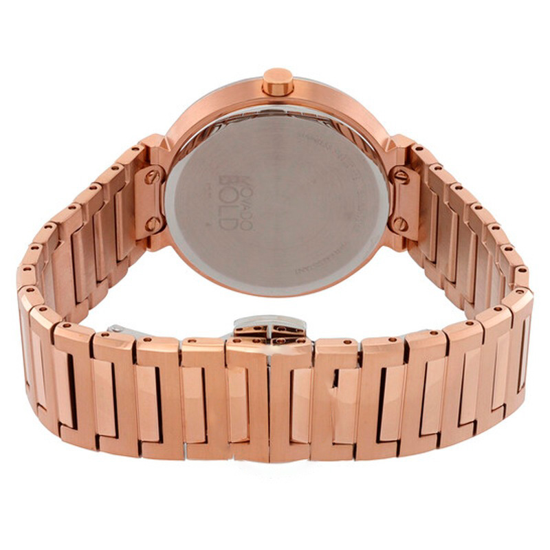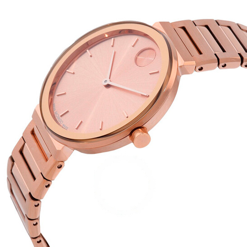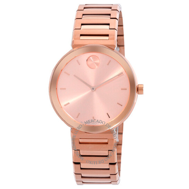 O Movado Mostrador em rosa de quartzo ousado 34 mm equilibra superfícies polidas e escovadas para um jogo de luz refinado. caixa em rosa, 34 mm. Texturas bem resolvidas falam de precisão e cuidado à mão.