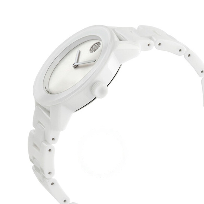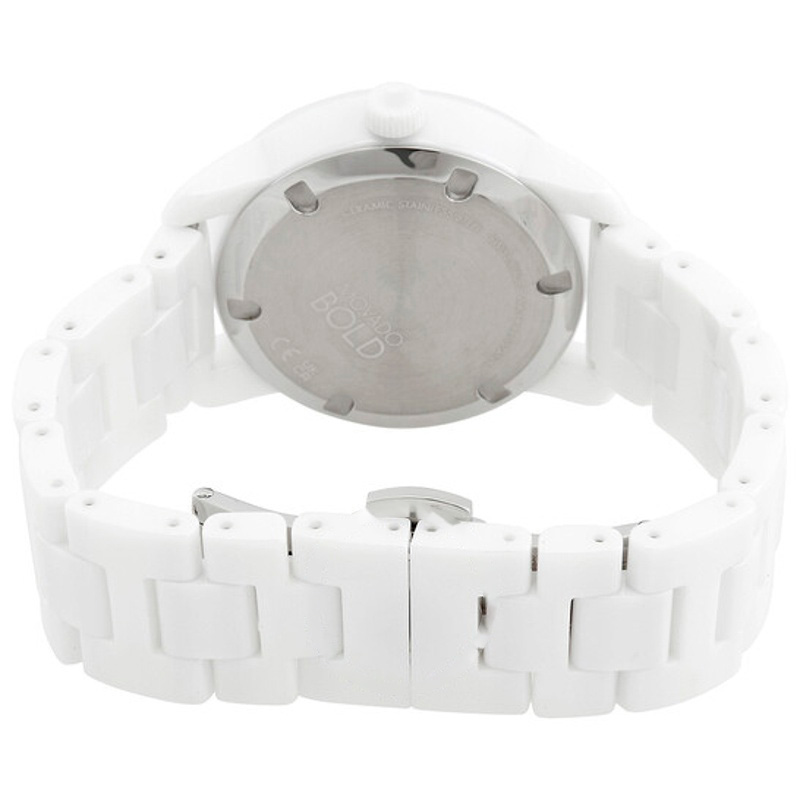O Movado Mostrador de museu em prata e branco de quartzo de cerâmica ousado 36 mm mostra como a precisão também pode ser um gesto de estilo. caixa em cerâmica, 36 mm. Texturas bem resolvidas falam de precisão e cuidado à mão.