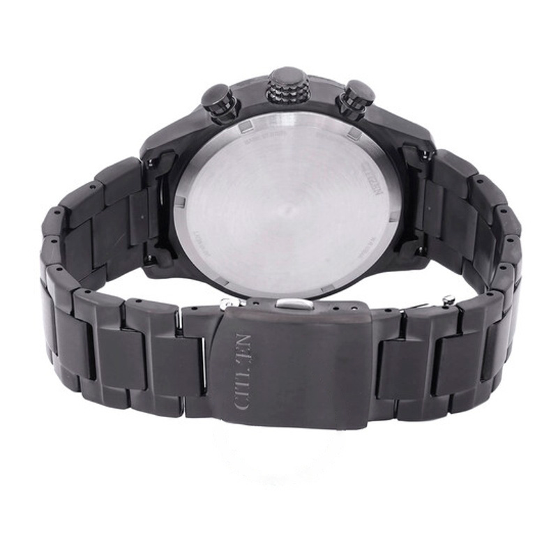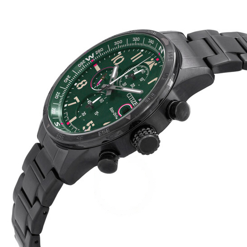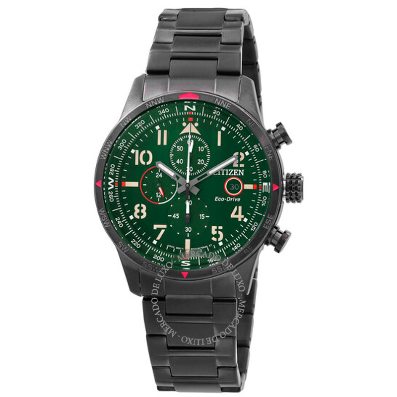 O Citizen Cronógrafo Mostrador Verde 43 mm Interpreta os códigos da casa com serenidade e atenção à luz. Caixa em aço inoxidável, Mostrador preto, 43 mm.