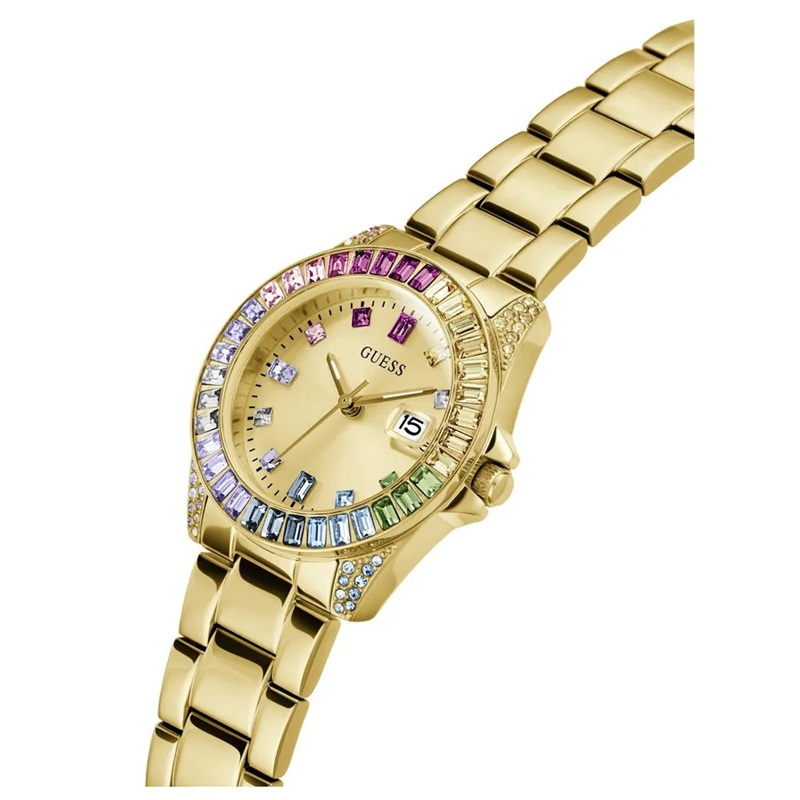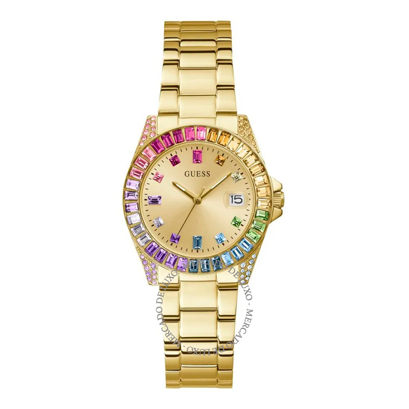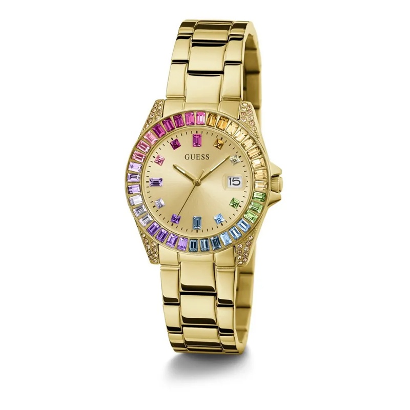 O Guess Opaline traduz a linguagem da alta relojoaria com proporções impecáveis e acabamento de ateliê. Com caixa em aço inoxidável, mostrador champagne, entrega presença sofisticada e brilho discreto. Uma criação pensada para atravessar tendências com elegância.