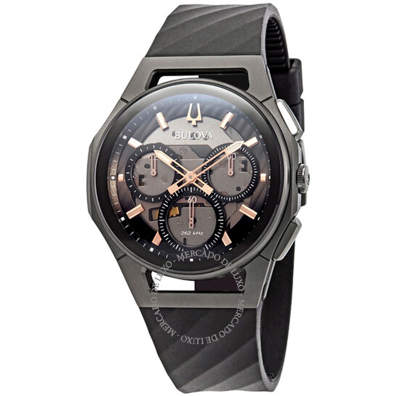 O Bulova Cronógrafo Curvo Mostrador Cinza Escuro 44 mm Equilibra herança e desenho atual em proporções bem resolvidas. Caixa em rosa, titânio, Mostrador preto, 44 mm.