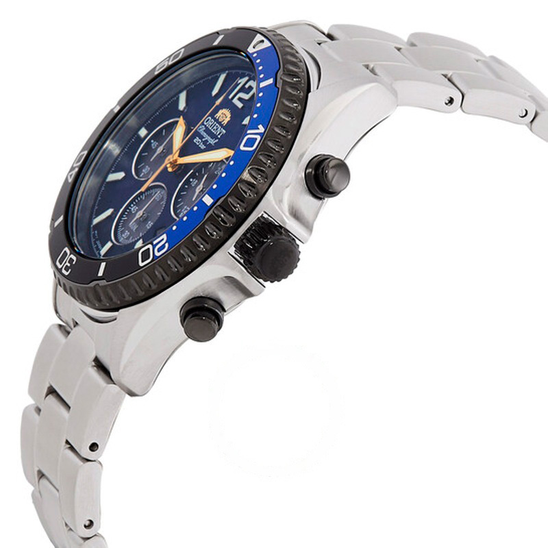O Orient Cronógrafo esportivo movido a energia solar com mostrador azul 42 mm Traz uma leitura arquitetônica do tempo com superfícies bem trabalhadas. Caixa em aço inoxidável, Mostrador azul, 42 mm.