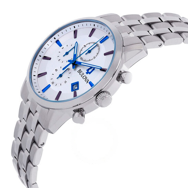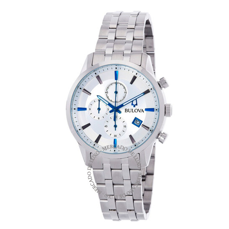 O Bulova Sutton Chronograph Quartz Mostrador Prateado 41 mm Equilibra herança e desenho atual em proporções bem resolvidas. Caixa em aço inoxidável, Mostrador azul, 41 mm.