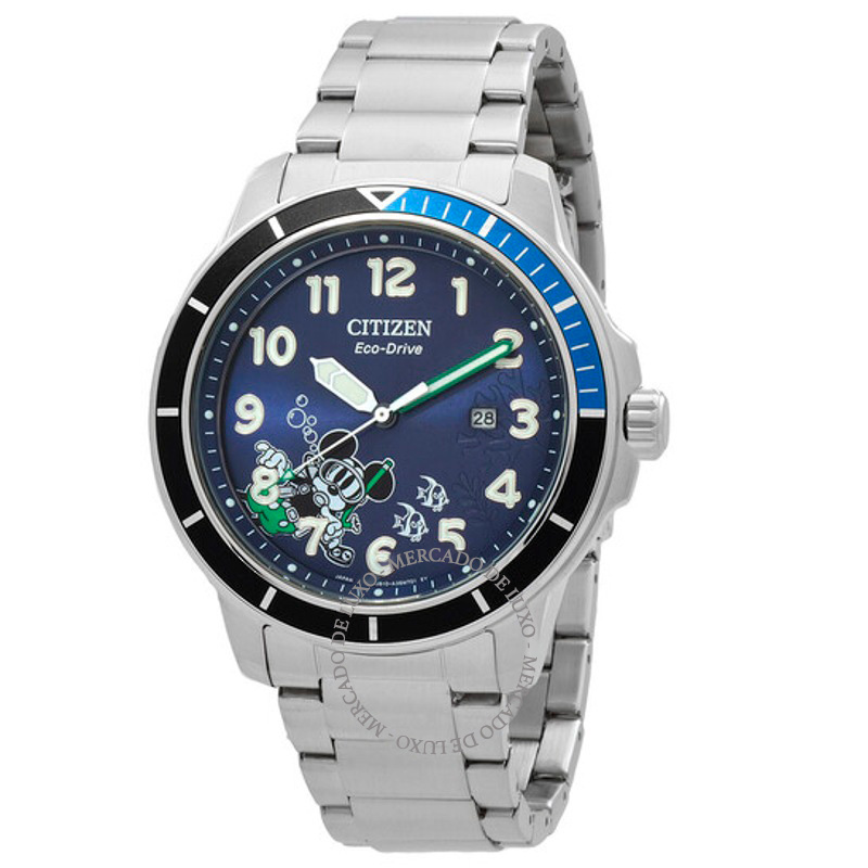 O Citizen Mickey Water Sport Eco-Drive Mostrador Azul 46 mm Traz uma leitura arquitetônica do tempo com superfícies bem trabalhadas. Caixa em aço inoxidável, Mostrador azul, 46 mm.