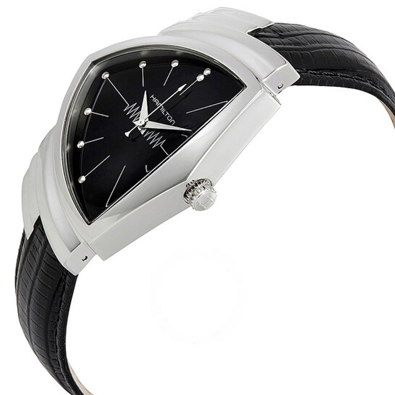 O Hamilton Watch Ventura Mostrador Preto 50 mm Interpreta os códigos da casa com serenidade e atenção à luz. Caixa em aço inoxidável, Mostrador preto, 50 mm.