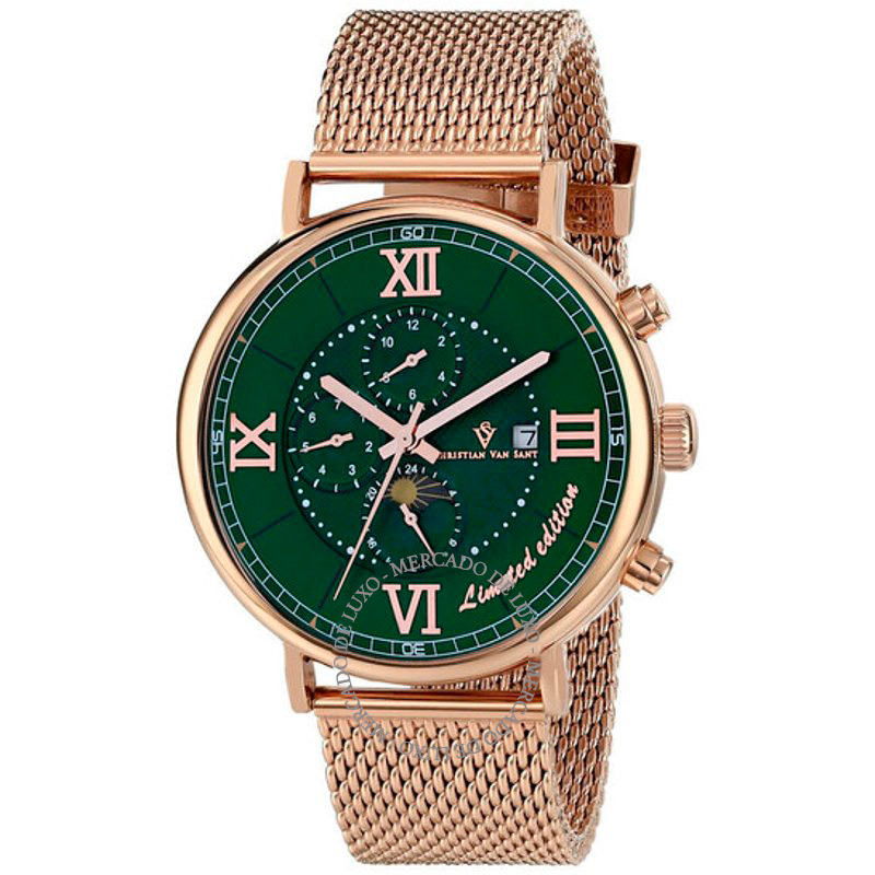 O Christian Van Sant Somptueuse LTD Cronógrafo Mostrador Verde Automático 46 mm Aposta em linhas limpas e volume preciso — luxo que não grita. Caixa em aço inoxidável, rosa, Mostrador verde, 46 mm.