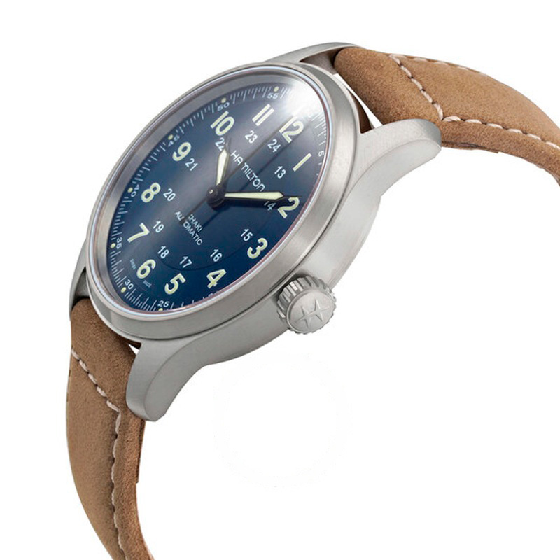 O Hamilton Watch Khaki Field Automático Mostrador Azul 42 mm Traz uma leitura arquitetônica do tempo com superfícies bem trabalhadas. Caixa em titânio, Mostrador azul, 42 mm.