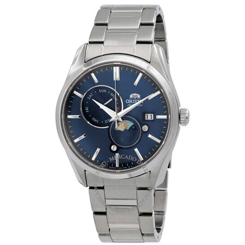 O Orient Mostrador Azul Sol e Lua 42 mm Interpreta os códigos da casa com serenidade e atenção à luz. Caixa em aço inoxidável, Mostrador azul, 42 mm.