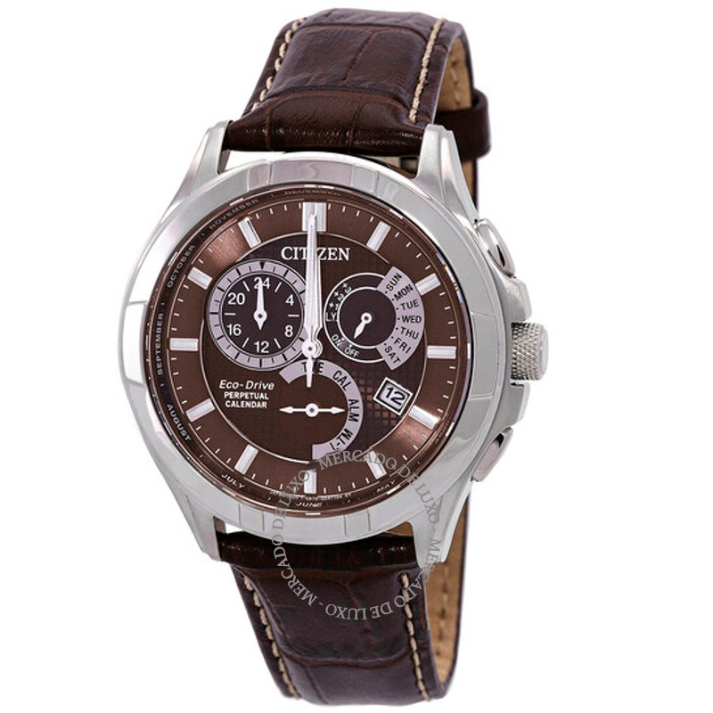 O Citizen Eco-Drive Perpetual GMT Mostrador Marrom 43 mm Traz uma leitura arquitetônica do tempo com superfícies bem trabalhadas. Caixa em aço inoxidável, Mostrador prateado, 43 mm.
