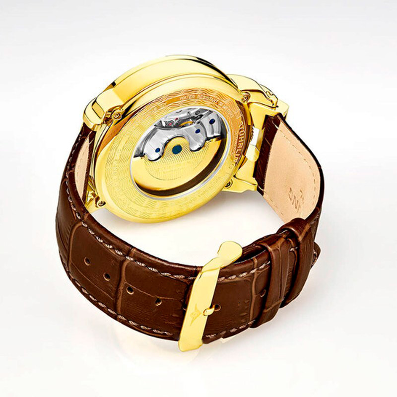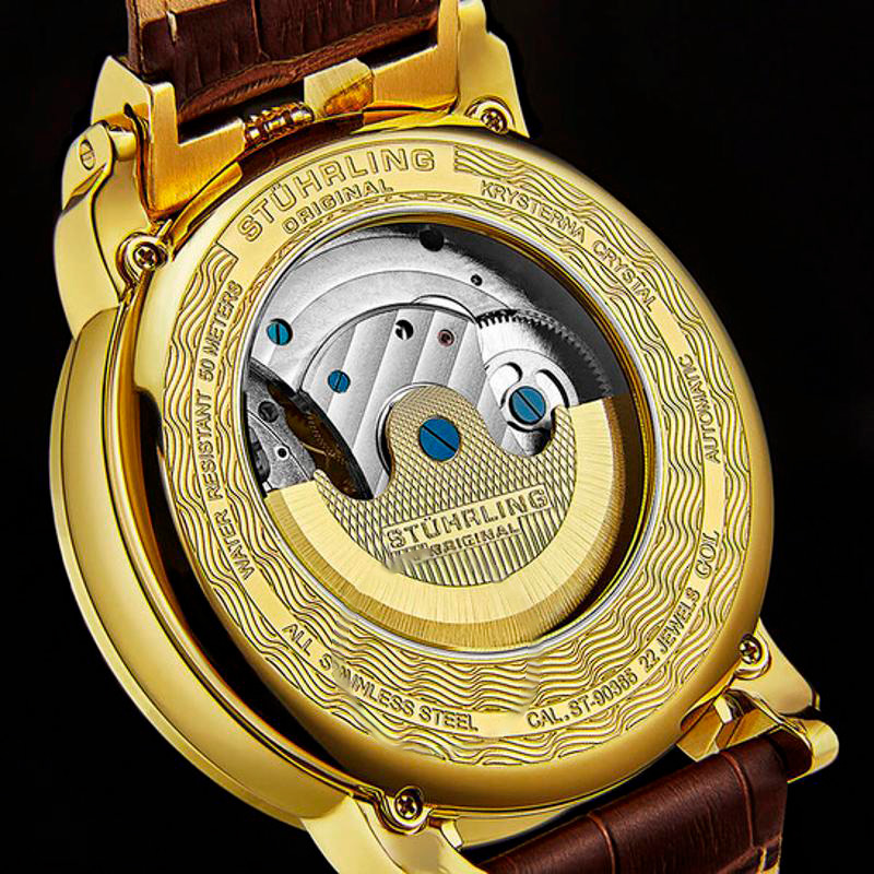O Stührling Original Mostrador dourado automático Legacy Um estudo de proporções que privilegia conforto no pulso e presença. Mostrador champagne.