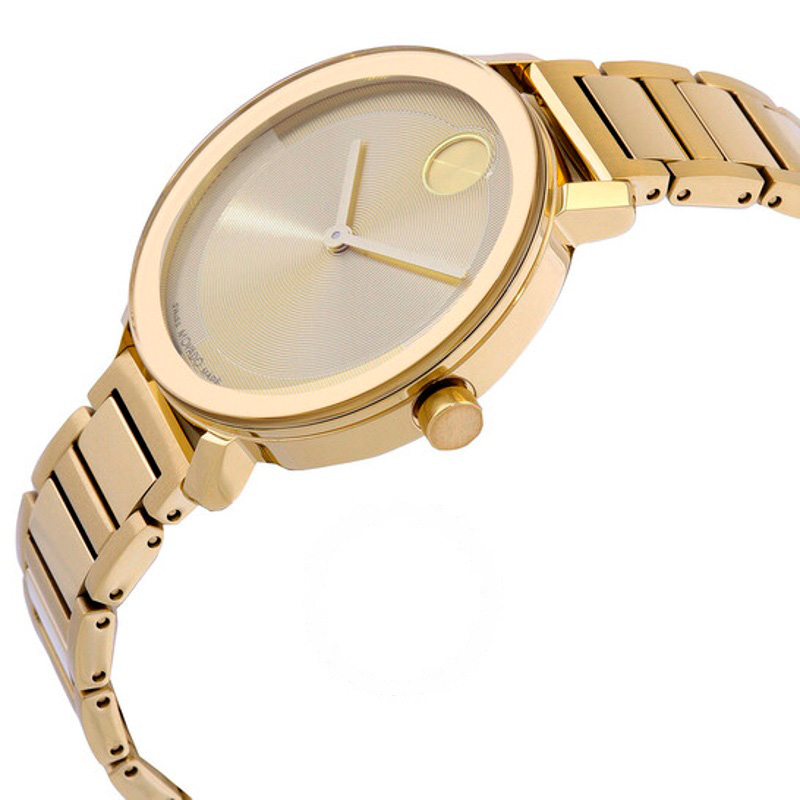 O Movado Bold Evolution 2.0 Quartzo Mostrador Dourado 34 mm combina proporções clássicas a detalhes de atelier que fazem a diferença no pulso. caixa em aço inoxidável, amarelo, mostrador champagne, 34 mm. Texturas bem resolvidas falam de precisão e cuidado à mão.