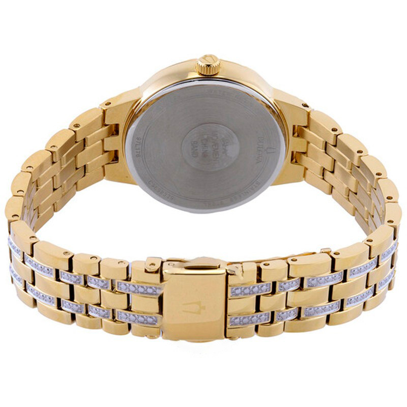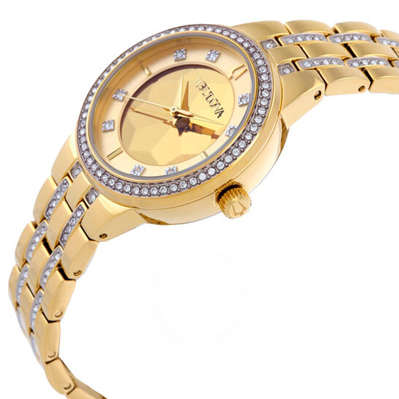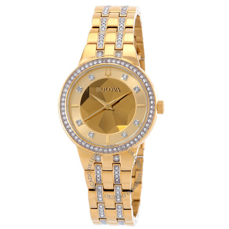 O Bulova Mostrador de cristal de quartzo fantasma champanhe apresenta um estudo de volumes, texturas e reflexos digno de vitrine. Resultado visual com faces facetadas e arestas suaves.