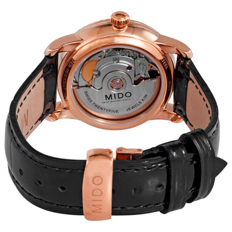 O Mido Baroncelli Automático 33 mm traz design de linhas limpas e presença silenciosa — o luxo que não precisa anunciar-se. caixa em aço inoxidável, rosa, luneta cravejada de, mostrador preto com, 33 mm. Texturas bem resolvidas falam de precisão e cuidado à mão.