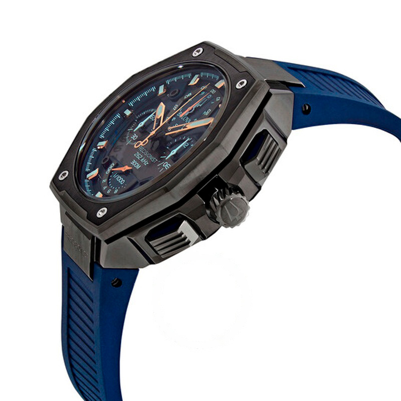 Tecnologia e artesanato se encontram numa construção confiável e confortável no uso. Movimento quartzo, complicações: data, cronógrafo, vidro safira, pulseira borracha.