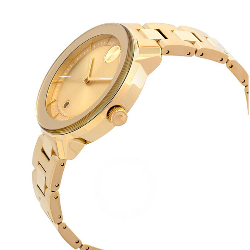 O Movado Bold Verso Quartz Gold Dial 38 mm equilibra superfícies polidas e escovadas para um jogo de luz refinado. caixa em aço inoxidável, mostrador champagne, 38 mm. Texturas bem resolvidas falam de precisão e cuidado à mão.