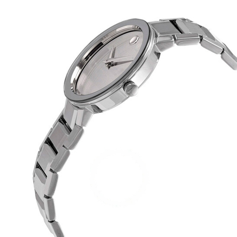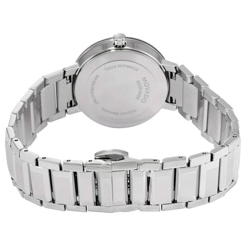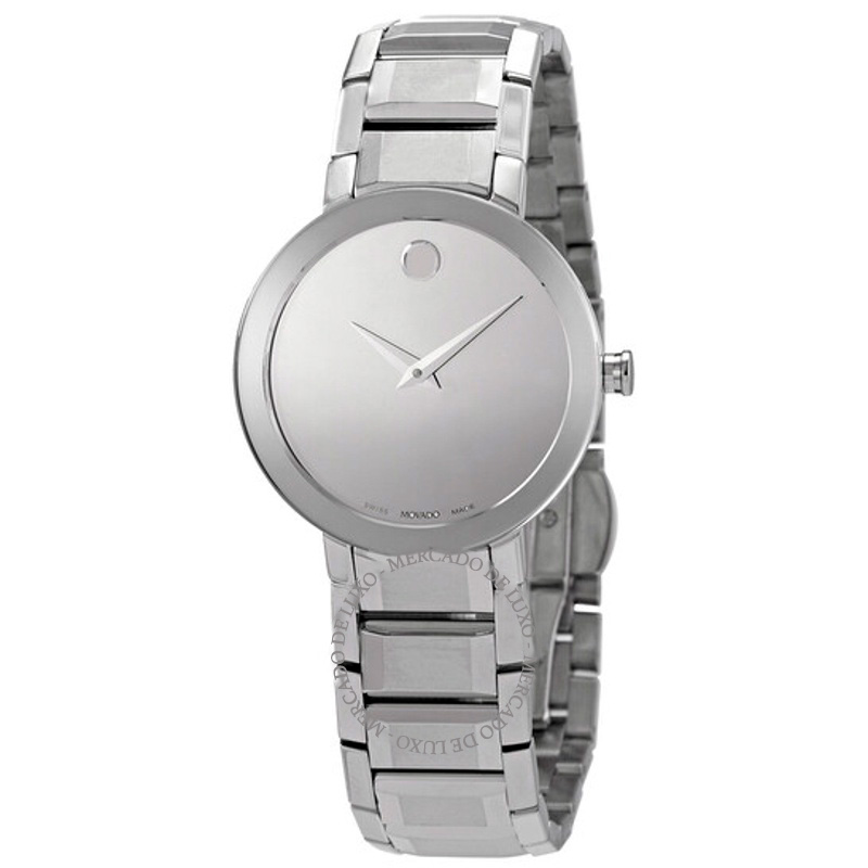 O Movado Mostrador espelhado prateado de quartzo safira 0 28 mm equilibra superfícies polidas e escovadas para um jogo de luz refinado. mostrador prateado, 28 mm. Texturas bem resolvidas falam de precisão e cuidado à mão.