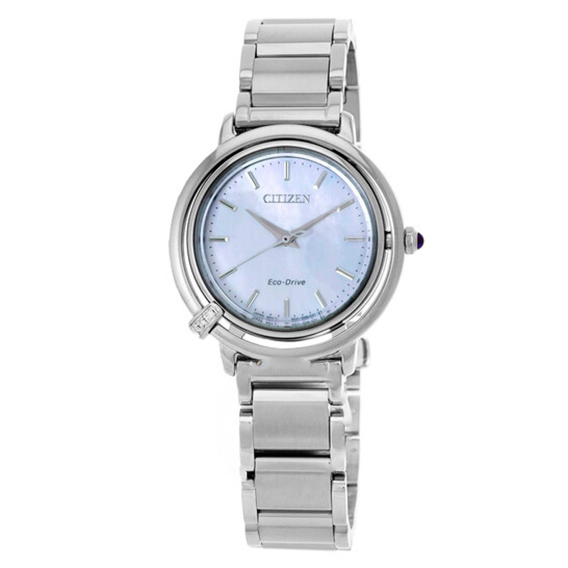 O Citizen Mostrador em madrepérola L Eco-Drive 31 mm revela sua assinatura estética com linhas nítidas e proporções equilibradas. caixa em aço inoxidável, mostrador madrepérola, 31 mm. Resultado visual com acabamento meticuloso.